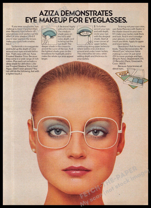 Aziza 1970s Magazine Print Ad 1975 Face Close-up Eye Makeup for Eyeglasses