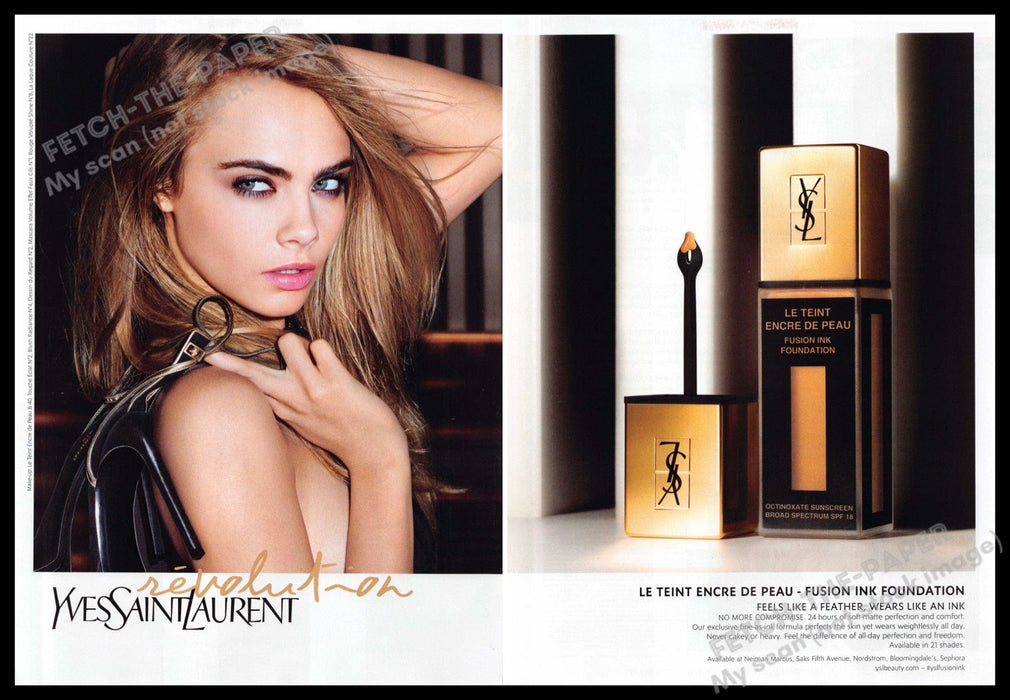 This striking 2014 Yves Saint Laurent 2-page print advertisement features actress Cara Delevingne. The ad showcases YSL's Le Teint Encre de Peau Fusion Ink Foundation, highlighting its luxurious and innovative qualities. The left page captures Cara Delevingne's captivating gaze, embodying the elegance and sophistication of the Yves Saint Laurent brand, while the right page presents the product in its sleek, golden packaging.