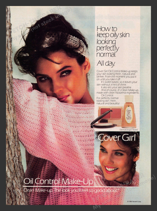 This vintage 1985 Cover Girl advertisement features actress Carol Alt showcasing the brand's Oil Control Make-Up. The ad highlights the product's a...
