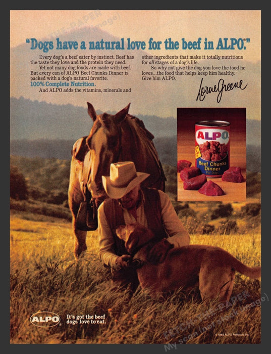 This 1984 Alpo Dog Food print advertisement features actor Lorne Greene and his dog in a serene countryside setting. The ad highlights the natural love dogs have for the beef in Alpo, emphasizing the product's complete nutrition and the added vitamins, minerals, and other nutritious ingredients that make it ideal for all stages of a dog's life. The image captures the essence of the 1980s with its rustic charm and wholesome appeal.