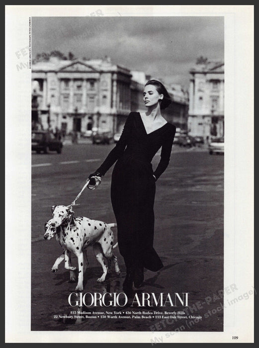 This Giorgio Armani print advertisement from the 1990s showcases a sophisticated woman elegantly walking two Dalmatian dogs. The black and white image captures the essence of timeless fashion and urban sophistication, typical of the era's high fashion photography.