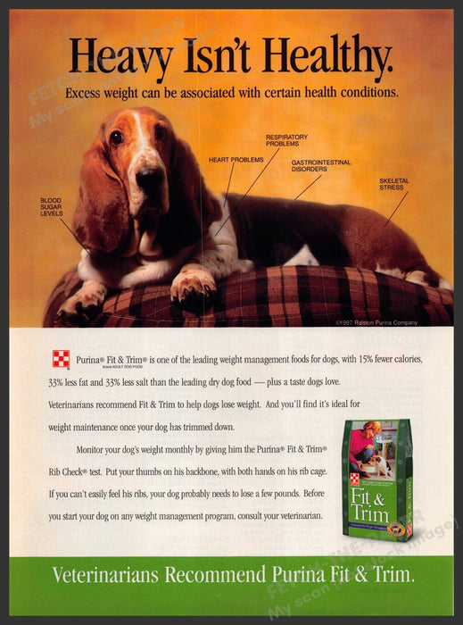 This 1998 Purina Fit & Trim print advertisement features a charming Basset Hound, emphasizing the importance of weight management for dogs. The ad highlights how excess weight can lead to various health issues such as heart problems, respiratory problems, gastrointestinal disorders, skeletal stress, and blood sugar levels. The backdrop and design elements reflect the 1990s era, adding a nostalgic touch.