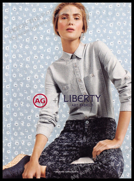 This magazine print ad from the 2010s showcases a collaboration between AG Jeans and Liberty Fabrics, released in 2013. The image features a model wearing a stylish outfit that combines AG Jeans' contemporary denim with Liberty Fabrics' classic patterns. The ad highlights the fusion of modern fashion with timeless textile art.