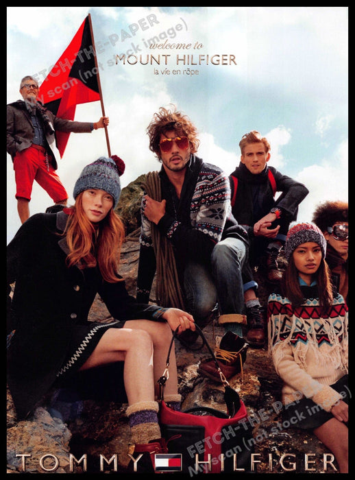 Step into the stylish world of Tommy Hilfiger with this captivating 2014 magazine print ad, showcasing a group of fashionable individuals enjoying the rugged beauty of Lake Tahoe. The image captures the essence of the 2010s fashion era with its vibrant and cozy winter attire. Prominently featured are bold knit sweaters, trendy beanies, and eye-catching accessories, all set against a picturesque mountainous backdrop. The ad exudes a sense of adventure and family bonding, making it a perfect collector's item for fashion enthusiasts.