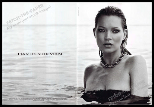 This stunning 2010s David Yurman print advertisement features the iconic model Kate Moss, elegantly posed in water. The black and white two-page sp...