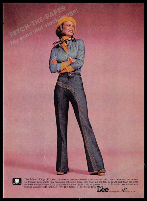 This vintage 1976 Lee Jeans magazine print advertisement showcases the stylish "New Body Stripes" from the 1970s. The ad features a model confident...