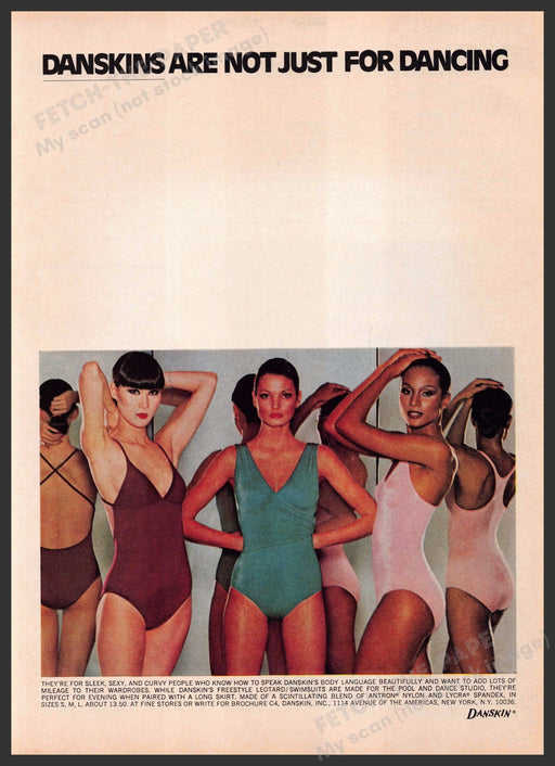This vintage 1976 Danskin print ad showcases the versatility and allure of Danskin leotards and swimsuits. The advertisement features a group of sl...