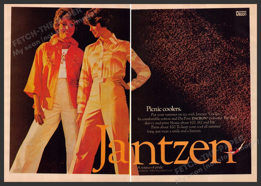 This vintage 1970s Jantzen clothing print ad showcases stylish summer outfits perfect for keeping cool. The ad features two women dressed in fashio...