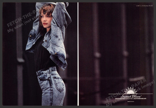Magazine print Advertisement1987Sunset Blues Jeanswear2 page advertisementMeasures approximately 8.5" x 11" (each page)(left and right images may n...