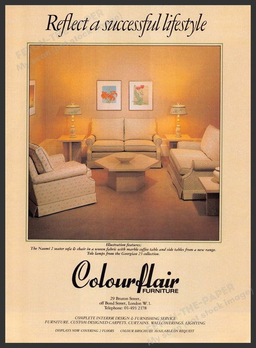 Step back into the 1980s with this original print advertisement for Colour Flair Furniture, featuring the elegant Naomi sofa and chair set. The ad showcases a beautifully coordinated living room with a two-seater sofa and matching chair in woven fabric, complemented by a marble coffee table and side tables. The warm lighting from the Tole lamps of the Georgian 23 collection adds a sophisticated touch to the setting.