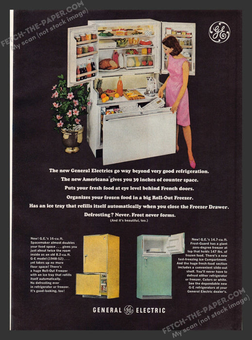 This vintage 1965 General Electric refrigerator advertisement showcases the innovative features of the new Americana model. The ad depicts a woman in a stylish pink dress standing beside the open refrigerator, which is filled with fresh produce, beverages, and other food items. The ad highlights the spacious interior and the convenience of the eye-level French doors and the large Roll-Out Freezer.