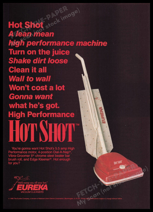 This vibrant 1990s Eureka Vacuum Cleaner print advertisement showcases the high-performance Hot Shot model. The ad highlights the sleek design and powerful features of the vacuum, emphasizing its efficiency and effectiveness in cleaning. The bold red text on a dark background captures the energetic and dynamic spirit of the era, making it a striking piece for collectors and enthusiasts of vintage advertisements.