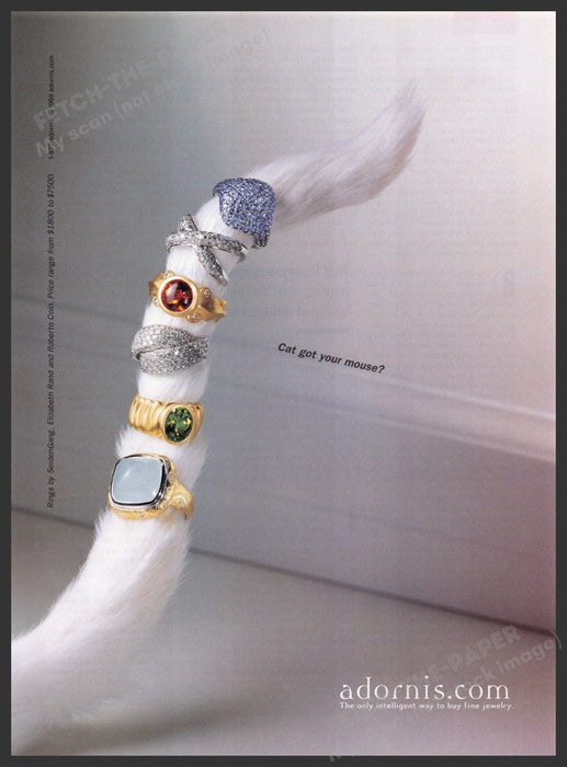 This unique Adornis print advertisement from the 2000s showcases an array of exquisite jewelry rings elegantly displayed on a cat's tail. The playful and creative visual captures attention, making it a memorable piece for collectors and jewelry enthusiasts alike. Measuring approximately 8.5" x 11", this original ad was carefully removed from a printed publication.