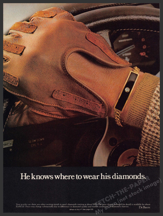 This vintage 1979 DeBeers advertisement showcases a sophisticated men's ID bracelet, elegantly adorned with a diamond. The image captures the essence of luxury and style from the 1970s, featuring a gloved hand gripping a steering wheel, highlighting the bracelet's refined design and the timeless allure of diamonds.