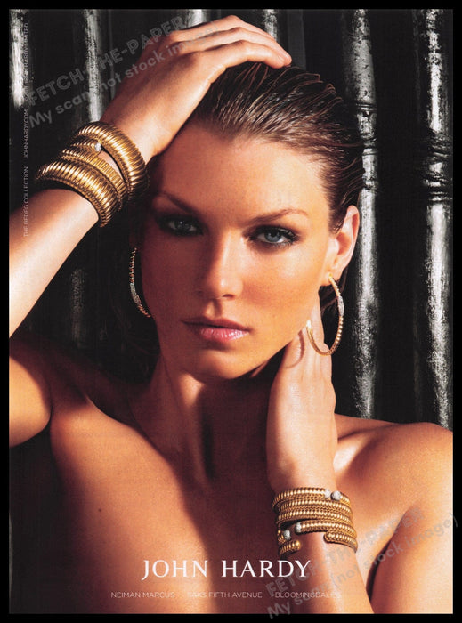 This original John Hardy jewelry print advertisement from the 2000s features a striking image of a wet-haired model showcasing the elegance and sophistication of John Hardy's designs. The model is adorned with exquisite gold bracelets and hoop earrings, highlighting the brand's luxurious craftsmanship.