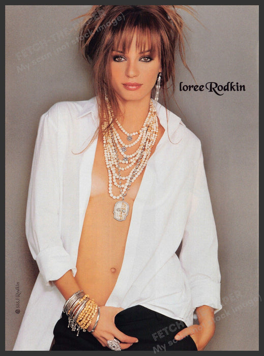 This stunning 2006 Loree Rodkin jewelry advertisement captures the essence of early 2000s fashion with a bold and sensual display. The model showcases an array of exquisite jewelry pieces, including layered necklaces with intricate designs, statement rings, and a collection of bangles. The open white shirt reveals bare skin, adding a touch of allure and highlighting the beauty of the jewelry.
