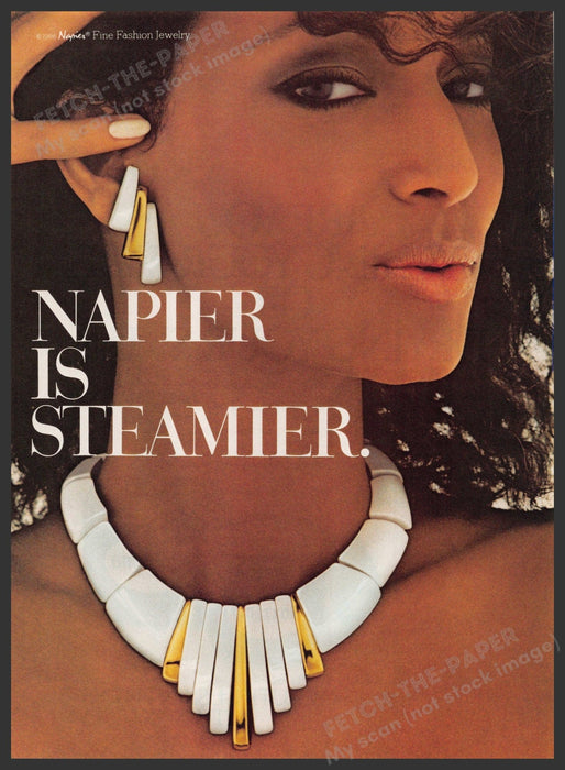 This vintage 1986 Napier Jewelry advertisement showcases the elegance and bold style of the 1980s. The ad features a close-up of a model wearing striking white and gold jewelry, including a statement necklace and matching earrings, epitomizing the era's fashion trends. The tagline "Napier is Steamier" highlights the brand's allure and sophistication.
