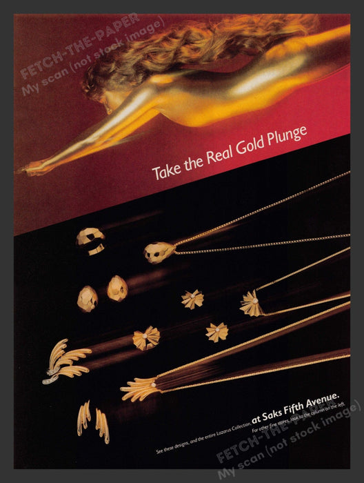 This 1983 print ad from Saks Fifth Avenue showcases the elegance and allure of the Lazarus Collection jewelry. The top half of the advertisement features a striking image of a woman with flowing hair and golden skin, embodying the essence of luxury and sophistication. Below, an array of exquisite gold jewelry pieces is displayed against a dark background, highlighting their intricate designs and craftsmanship.