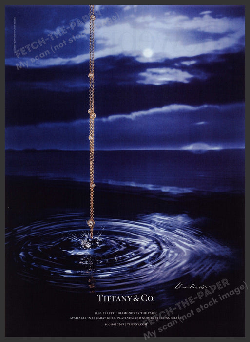 This 2009 Tiffany & Co. advertisement showcases the exquisite Elsa Peretti Necklace, part of the "Diamonds by the Yard" collection. The ad features a stunning image of the necklace gracefully dipping into water, creating ripples that highlight its elegance and beauty. Set against a serene backdrop of a moonlit night, this ad captures the timeless allure and sophistication of Tiffany & Co. jewelry from the 2000s.