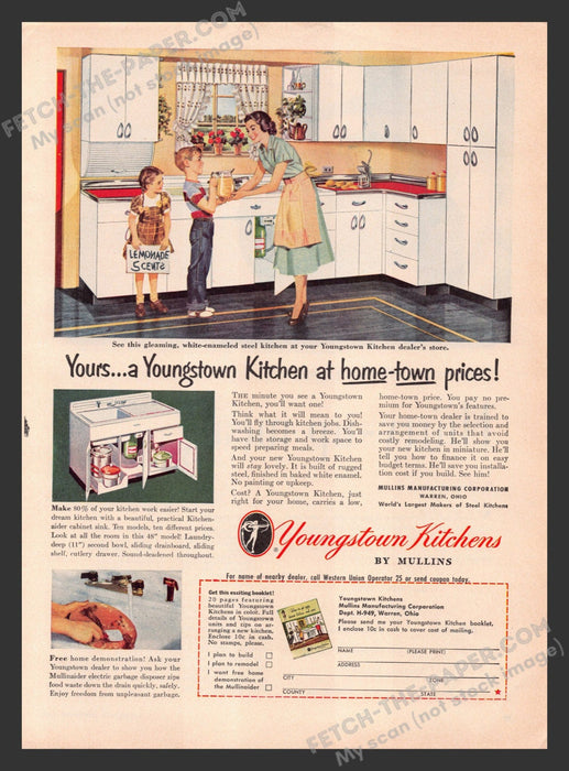 Step back into the 1940s with this charming Youngstown Kitchens by Mullins print advertisement. This vintage ad showcases a gleaming, white-enameled steel kitchen, highlighting the era's focus on modernity and efficiency. The scene depicts a mother and her children enjoying a lemonade stand, emphasizing the family-friendly design and practical features of the kitchen.