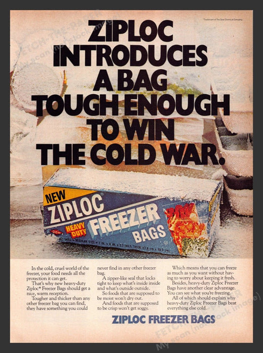 In this vibrant 1979 print advertisement, Ziploc introduces their new heavy-duty freezer bags, emphasizing their durability and ability to protect food in the harsh conditions of a freezer. The ad features a bold headline stating, "Ziploc introduces a bag tough enough to win the cold war," highlighting the superior quality and reliability of these freezer bags. The image showcases a frosty box of Ziploc Freezer Bags, surrounded by icy conditions, reinforcing the product's strength and effectiveness in preserving food.