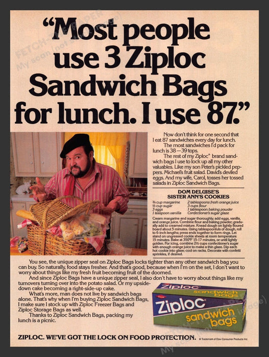 This 1986 print advertisement for Dow Ziploc Sandwich Bags features the beloved Dom DeLuise in a humorous and engaging kitchen scene. The ad highlights the convenience and reliability of Ziploc Sandwich Bags, emphasizing their unique zipper seal that keeps food fresh and secure. Dom DeLuise humorously shares how he uses an abundance of Ziploc bags for his large lunches and other storage needs, making this ad a nostalgic piece from the 1980s.