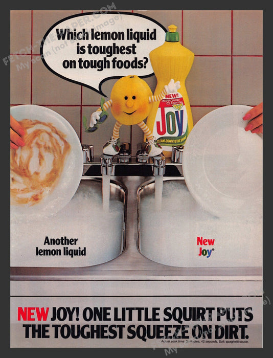 This vibrant 1980s print ad showcases the effectiveness of Joy Lemon Liquid Dish Cleaner. The advertisement features a playful lemon character comparing the cleaning power of Joy against another lemon liquid. The imagery highlights Joy's superior ability to tackle tough food residues with just one squirt, making it a must-have for any kitchen.
