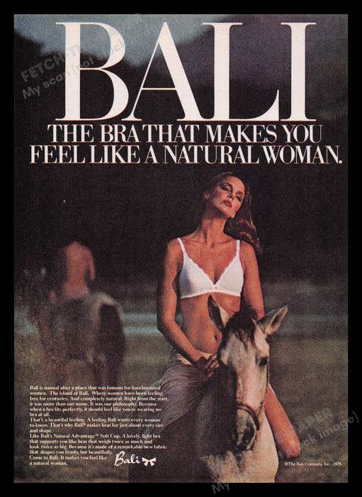 This vintage 1978 Bali lingerie print ad showcases a woman confidently riding a horse, embodying the essence of natural beauty and freedom. The advertisement highlights Bali's commitment to creating bras that feel as natural as not wearing one at all, emphasizing comfort and support.