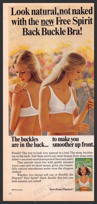 This 1970s Playtex Free Spirit print ad showcases the new Back Buckle Bra, emphasizing a natural look without compromising comfort. The ad features two women demonstrating the bra's design, highlighting the back buckle feature that ensures a smooth front appearance. The vibrant, floral background adds to the free-spirited and natural theme of the decade.