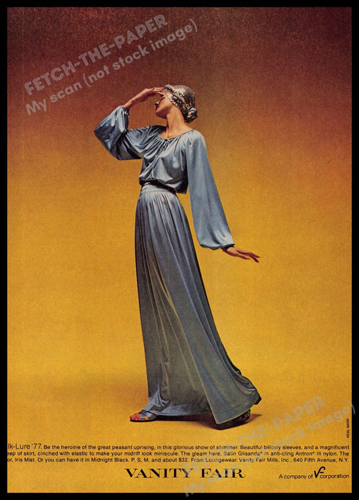This 1977 Vanity Fair advertisement showcases a stunning Folk-Lure nightgown, epitomizing the elegance and style of the 1970s. The model is adorned in a flowing satin gown with billowy sleeves, cinched at the waist to accentuate the midriff. The ad highlights the luxurious fabric and the sophisticated design, capturing the essence of 1970s fashion.