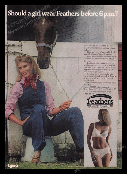 This vintage 1977 print advertisement showcases the elegance and allure of Young Smoothie's Feathers lingerie collection. The ad features a woman exuding confidence and style, posing with a horse, embodying the free-spirited and sophisticated vibe of the 1970s. The lingerie set includes a seamless bra and brief, designed to enhance natural curves and provide all-day comfort.