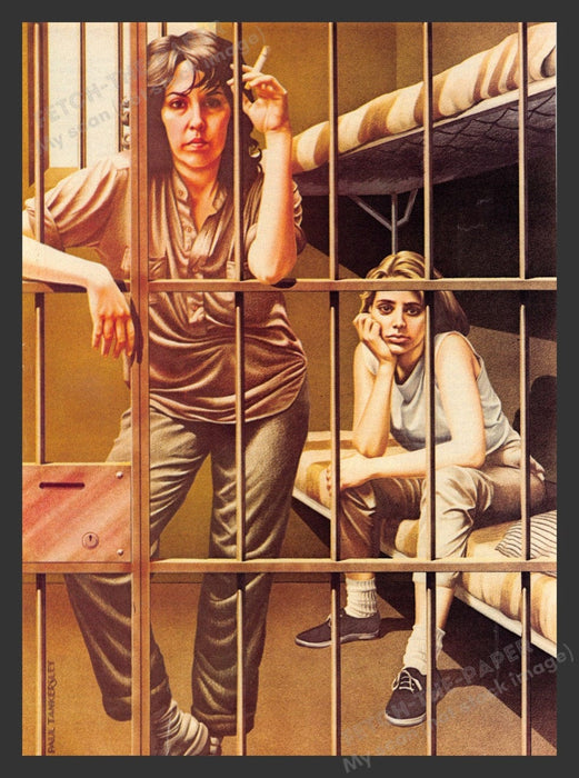 This 1984 magazine illustration by artist Paul Tankersley depicts a poignant scene of two women in a prison cell. The image captures the somber mood of confinement, with one woman standing pensively by the bars, holding a cigarette, while the other sits on a bunk bed, lost in thought. The detailed artwork vividly reflects the emotions and atmosphere of the era.