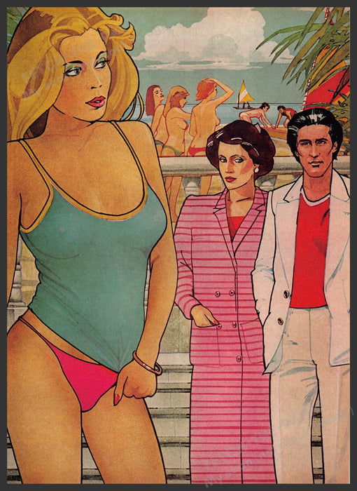 This stunning 1981 magazine illustration by George Gaadt captures the essence of the 1980s with its vibrant colors and bold imagery. The scene features a striking woman in a turquoise tank top and pink bikini bottom, exuding confidence and allure. In the background, a sophisticated couple dressed in stylish attire adds a touch of elegance to the beachside setting, while other figures enjoy the sunny day. This original magazine page measures approximately 8" x 11".