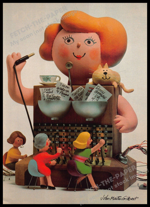 This whimsical 1977 magazine illustration by John Martin Gilbert, titled "Confessions of an Answering Service," captures the playful essence of the 1970s. The artwork features a charming, cartoonish depiction of an answering service operator surrounded by colorful characters and a vintage switchboard, bringing to life the humorous side of communication in that era. Measuring approximately 8" x 11", this original magazine page is a delightful piece of nostalgia.