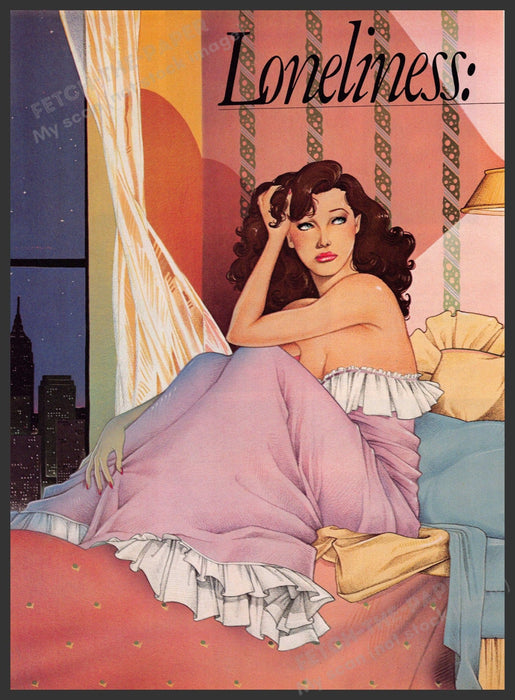 This captivating 1981 magazine illustration by artist John Randall Orth, titled "Loneliness," vividly captures the essence of solitude. The artwork features a woman with voluminous 1980s-style hair, sitting contemplatively in a bedroom setting. Her expression and posture convey a deep sense of introspection, enhanced by the soft, pastel color palette and intricate details of the bedding and room decor.