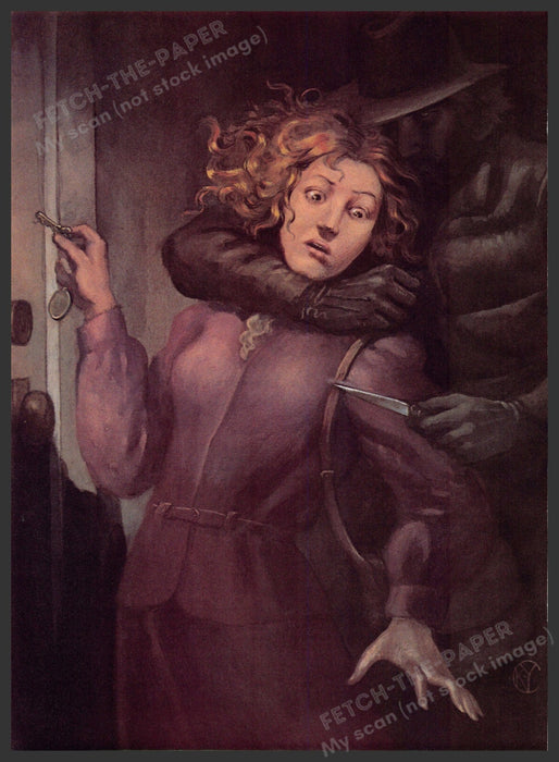 This captivating 1980s magazine illustration by renowned artist Kinuko Craft showcases a dramatic and intense scene. The artwork depicts a woman with striking curly hair, caught in a moment of peril as she is grabbed from behind by a shadowy figure holding a knife. The vivid expressions and detailed rendering evoke a sense of suspense and urgency typical of the era's artistic style.