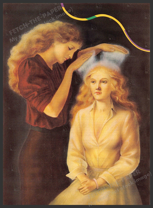 This captivating magazine illustration from 1984 by Kinuko Craft beautifully captures the essence of psychic healing. The artwork depicts a serene scene where one woman is channeling energy to another, showcasing the mystical and introspective nature of the 1980s. The soft, ethereal glow surrounding the subjects adds a touch of magic and tranquility to the image.