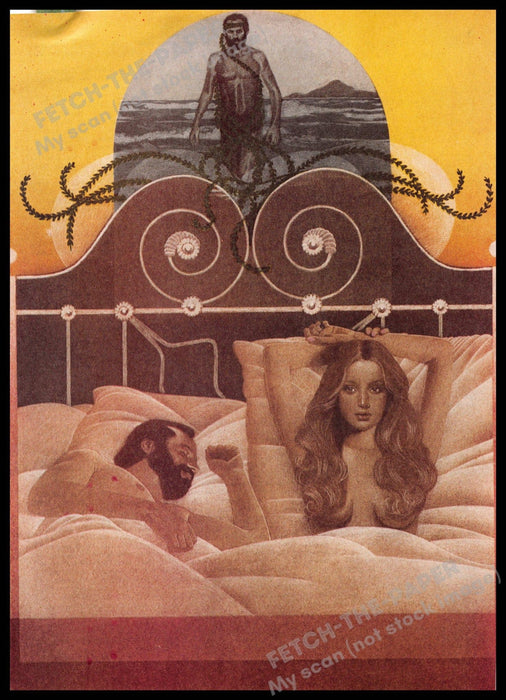 This captivating 1977 magazine illustration by Richard Harvey, titled "King of Atlantis," showcases a unique blend of fantasy and intimacy. The artwork features a serene bedroom scene with a man and woman in bed, while the upper portion depicts a powerful figure emerging from the sea, evoking the mythical aura of Atlantis. The intricate details and rich colors highlight the artistic style of the 1970s, making it a fascinating piece for collectors and art enthusiasts alike.