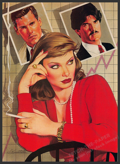 This captivating 1984 magazine illustration by Sharon Knettel showcases a woman in a striking red outfit, deep in thought, with two men's portraits behind her. The illustration vividly captures the essence of the 1980s with its bold colors and dramatic expressions, reflecting the era's distinctive style and fashion.