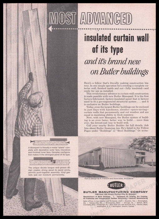 This 1950s print advertisement from Butler Manufacturing Co. showcases their revolutionary insulated Monopanels, designed for constructing advanced curtain walls on Butler buildings. The ad highlights the ease of installation and superior insulation properties of these panels, making them a standout feature in construction technology of the era. Measuring approximately 8" x 11", this original advertisement captures a moment in time when innovation in building materials was rapidly advancing.