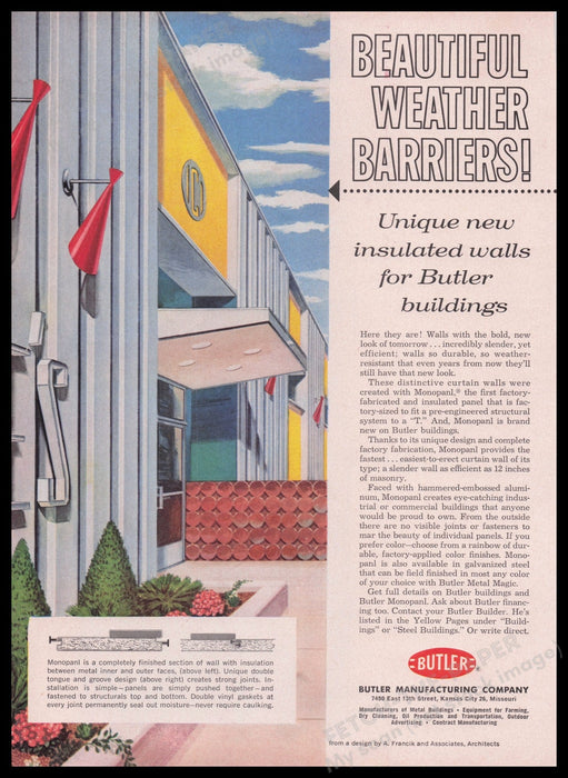 This vintage 1950s print advertisement showcases the innovative insulated walls by Butler Manufacturing Co. The ad highlights the modern, sleek design of these walls, emphasizing their durability and weather resistance. The image features a vibrant building exterior with bold colors and clean lines, capturing the essence of mid-century architectural style.