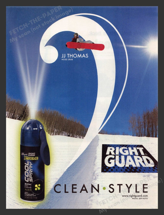 This 2004 Right Guard print advertisement features professional snowboarder JJ Thomas performing a stunning nose grab against a vibrant blue sky. The ad showcases the Right Guard Xtreme Cool Spray deodorant, emphasizing its clean and stylish appeal. The snowy backdrop and dynamic action capture the essence of early 2000s extreme sports culture.