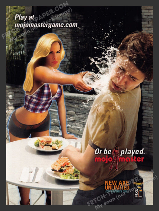 This 2005 Axe Unlimited Mojo Master print ad captures a humorous and edgy scene typical of the 2000s. The image showcases a young man at an outdoor cafe, being splashed in the face with water by a striking blonde woman in a revealing checkered top and shorts. The tagline "Or be played" emphasizes the playful and flirtatious nature of the Axe brand. This advertisement is a perfect example of the bold and provocative marketing style of the era.