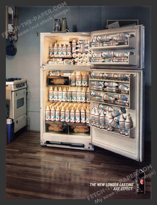 This vibrant 2000s Axe Touch Whip Cream print ad showcases a refrigerator packed full of whipped cream cans, emphasizing the playful and enticing nature of the Axe brand. The ad captures the essence of the 2000s with its bold and humorous approach, making it a unique collectible for fans of vintage advertisements.