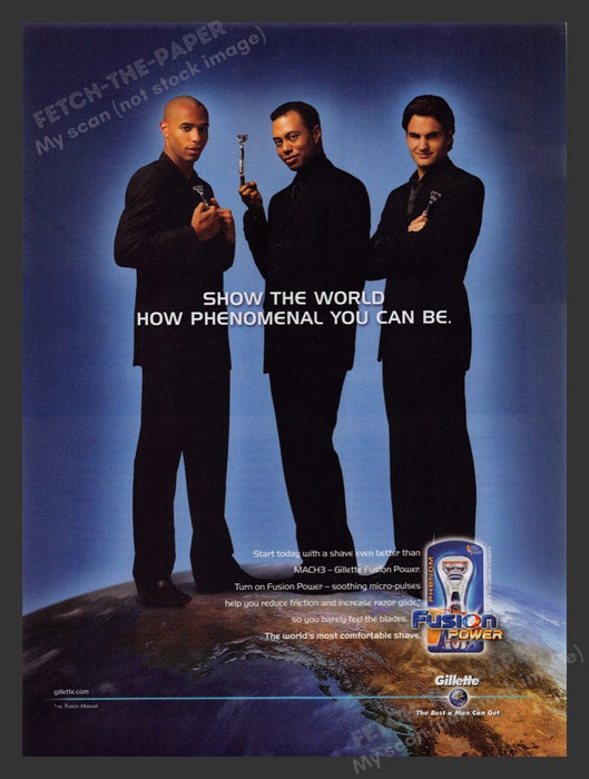 This 2008 Gillette Fusion Razor print advertisement features renowned sports icons Thierry Henry, Tiger Woods, and Roger Federer. The trio is depicted in stylish black suits, each holding a Gillette Fusion Razor, symbolizing excellence and precision. The ad's tagline, "Show the world how phenomenal you can be," emphasizes the superior quality and performance of the razor.
