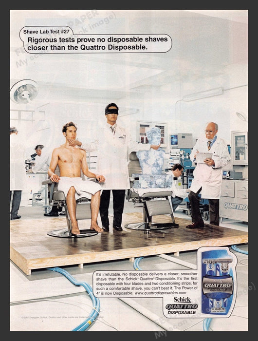 This 2008 Schick Quattro Razor print advertisement showcases a unique laboratory test setting where rigorous tests prove that no disposable shaves closer than the Quattro Disposable. The ad features a man seated in a lab, being tested by scientists to illustrate the superior performance of the razor. The image captures the essence of scientific precision and innovation from the late 2000s.