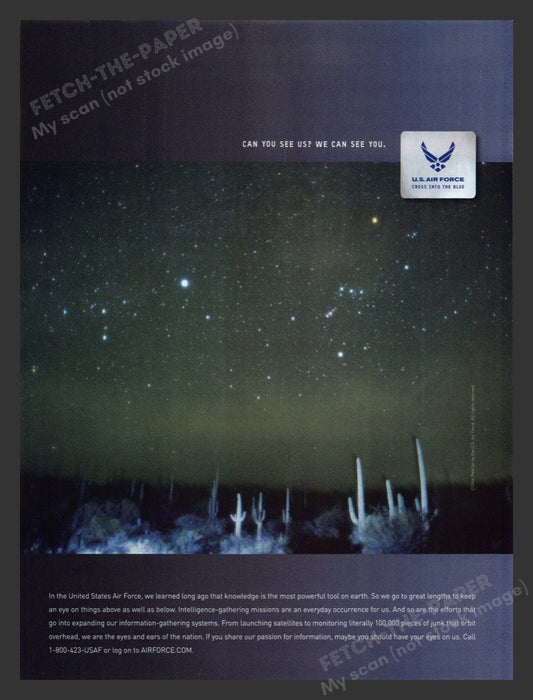 This U.S. Air Force print ad from the 2000s, specifically 2005, showcases the advanced surveillance capabilities of the military branch. The ad features a night sky filled with stars and a desert landscape below, emphasizing the theme "Can You See Us? We Can See You." This visually striking advertisement highlights the Air Force's commitment to intelligence-gathering and monitoring activities.