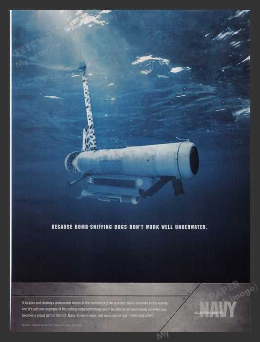 This 2008 U.S. Navy advertisement showcases an underwater bomb-sniffing device, emphasizing the advanced technology used by the Navy to locate and destroy underwater mines. The ad features the tagline "Because bomb-sniffing dogs don't work well underwater," highlighting the necessity and innovation of such technology. The image depicts the device submerged in water, illustrating its operational environment.