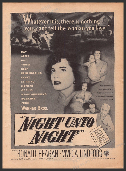 This vintage 1949 print advertisement showcases the release of the movie "Night Unto Night" starring Ronald Reagan and Viveca Lindfors. The ad captures the dramatic essence of this heart-gripping romance from Warner Bros, featuring intense expressions and scenes that promise to keep viewers remembering every stirring moment. The tagline, "Whatever it is, there is nothing you can't tell the woman you love!" highlights the emotional depth of the film.