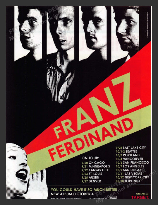 This original 2005 print advertisement showcases the iconic band Franz Ferdinand, promoting their concert tour dates across various cities in the 2000s. The ad features a striking black and white image of the band members, with bold red and green text highlighting the band's name and tour details. This vintage piece captures the essence of the early 2000s music scene.